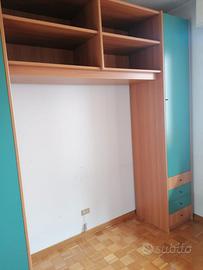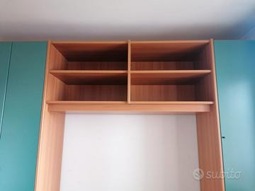 Bellissimo armadio "a ponte" verde salvia e ciliegio con scrivania ad angolo (come da foto), con piano fantasia e due mensole. Le misure sono: altezza mt 2,90 c.a. larghezza mt 3.15 lato scrivania mt. 1,70