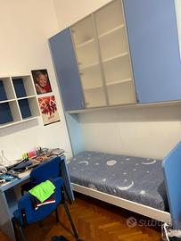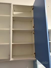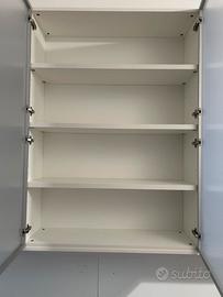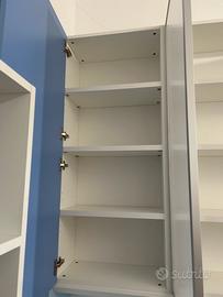 Armadio rialzato a ponte con spazio integrato per un letto. 4 compartimenti da 4 scaffali ciascuno, di cui due ad anta singola ed uno a doppia anta. Altezza: 258cm Larghezza: 210cm Profondità: 30cm