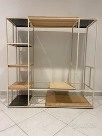 Si tratta di un armadio a vista, noto come cabina armadio aperta con ripiani in legno e metallo e appendiabiti. Questo tipo di arredo è una soluzione di design che combina funzionalità ed estetica ideale per un arredamento moderno da casa o come appenderia da Negozio. Misure L 125 H125 P42