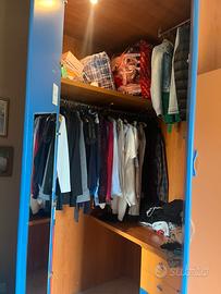 Vendo armadio ad angolo Misure: Armadio blu ad angolo: 260x60x120 Armadio arancione: 90x196x120 Compreso di cassettiera/comodino Armadio illuminato con due faretti Super spaziozo