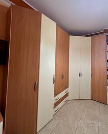 Presenta 7 ante: due ad angolo con cabina armadio che presenta due mensole e un appendi abiti alto.