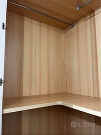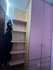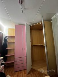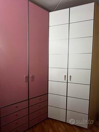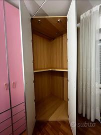 Vendo armadio ad angolo con: 2 ante, 6 cassetti, angolo diviso in zona superiore e inferiore con luci interne, 6 scaffali laterali che si possono spostare a seconda del lato scelto. Colore rosa e bianco. Per più informazioni scrivermi in privato. No consegna, smontaggio da effettuare dal compratore .