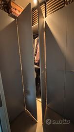 Armadio ad angolo per ripostiglio con aperture a battente. Misure: altezza 227 cm, profondità 60 cm, lunghezza lati 150 e 195 cm. Ripiani interni come da schizzo allegato. Nella parte ad angolo c’è un unico ripiano nel mezzo e ci sono quattro bastoni appendiabiti sopra e sotto. In un paio di punti lo schienale è tagliato x l’inserimento di quadri elettrici. Colore tortora. Usato ma in buone condizioni. Disponibile dalla prima settimana di marzo. SMONTAGGIO/MONTAGGIO E TRASPORTO a vs carico