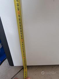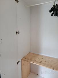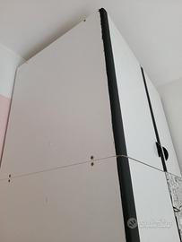 armadio bianco a 2 ante, stabile e alto composto da 2 unità (superiore e inferiore). altezza totale 260x90 cm circa larghezza. attualmente è pitturato di nero ai bordi e ha pellicola adesiva stile fumetto. trasporto e smontaggio a carico dell'acquirente