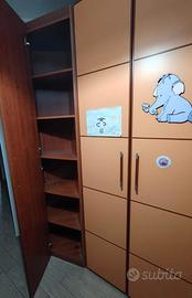 Vendo armadio angolare per camera bambini con 2 cassettiere come in foto. 4 ante, da sinistra anta libreria, doppia anta armadio con possibilità di montare due ripiani e a destra anta divisa a metà con doppio appendi-abiti.
