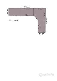 Vendo armadio angolare (mod. Luna mondo convenienza) colore grigio topo contenente 2 cassettiere al suo interno (una da 2 cassetti e l’altra da 3).Tutte le misure sono indicate nella terza foto.