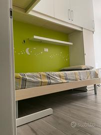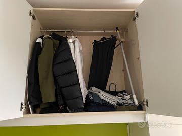 Armadio angolare a ponte in laminato colore rovere, bianco e verde mela largh.tot 2.70cm prof.60cm altezza tot 263cm. L'anta sinistra misura 52,5 cm il tutto sostenuto da due montanti in ferro e un pannello di colore verde, mensola con luce integrata.