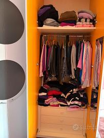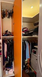 Armadio angolare con cabina armadio marca Mistral, esternamente rivestito con pellicola bianca lavabile (wrapping), ha profondità di 60 cm mentre la cabina è profonda 1,20 cm, anta piccola larghezza 45 cm, le 2 ante larghezza 90 cm, l'angolo ha larghezza di 1,16× 1,16 cm, altezza 2,60. Faretti interni che si accendono all'apertura delle porte. Ottime condizioni