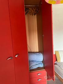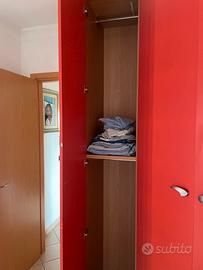 Vendo armadio angolare della prestigiosa linea Moretti Compact, ideale per camerette o spazi giovanili. Realizzato in legno effetto ciliegio con ante e dettagli in laccato rosso opaco, questo armadio si distingue per la sua robustezza, funzionalità e design vivace.