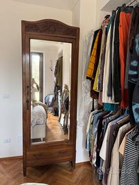 Armadio a un’anta con specchio, asta appendiabiti e cassetto. Intarsi floreali in cima. Altezza 228 Larghezza 80 Profondità 51