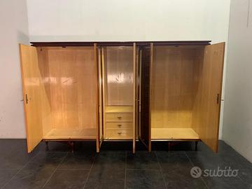 Armadio anni 50 in palissandro a 5 ante, il mobile e sorretto da basamento a crociera con puntali in ottone.