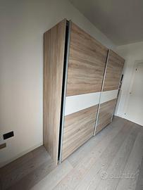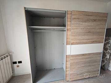 Armadio a 2 ante scorrevoli su rotaia , in buono stato usato 3 anni. Si trova già smontato e compreso di tutto, viteria e carrelli e bastoni appendi abito. Semplice montaggio. Misure in centimetri circa altezza 209 x spessore 60,5 x larghezza 213