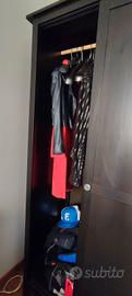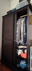Vendo armadio con ante scorrevoli in legno, colore nero/marrone scuro (IKEA). Struttura solida e in buono stato. Caratteristiche: Ante scorrevoli (2 ante) Interno con asta appendiabiti e ripiani Colore: nero/marrone scuro Dimensioni: 198×110×59 Trasporto a carico dell'acquirente. Prezzo: €43