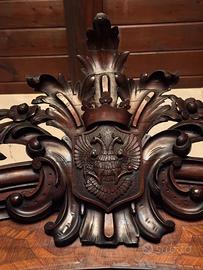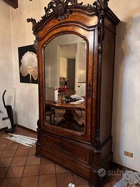 Privato vende prestigioso armadio ad un’anta di manifattura mitteleuropea (area asburgica), risalente alla seconda metà del XIX secolo (circa 1860-1880). Materiale: Realizzato in pregiata piuma di noce e radica, con venature "a macchia aperta" perfettamente simmetriche che creano un disegno naturale di grande impatto visivo. Dettagli di pregio: Importante fastigio superiore riccamente intagliato a mano con motivi a foglie d'acanto e scudo araldico centrale. Specchiera: Grande anta centrale con specchio originale dell'epoca (coevo al mobile). Base: Ampio cassetto inferiore con bocchetta originale e venatura specchiata. Stato di conservazione: Il mobile si presenta in ottime condizioni originali, con una splendida patina del tempo. Struttura solida e sana. Il mobile è un pezzo di alta ebanisteria, non una riproduzione moderna. Visionabile di persona per confermare la qualità degli incastri e del legno