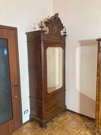 Armadio ad anta singola in legno impiallacciato, con specchio frontale e due cassetti inferiori.