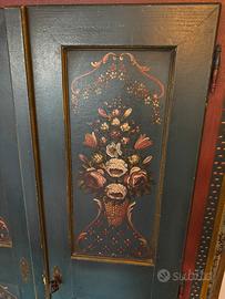 * Decorazioni: Presenta quattro grandi pannelli frontali finemente dipinti a mano con motivi floreali (vasi di fiori e boccioli) su una base di colore verde petrolio/blu scuro.