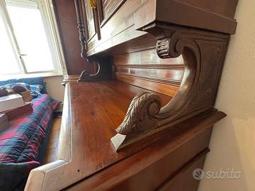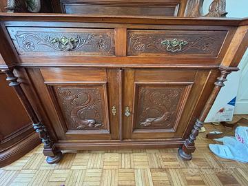 Armadio antico in legno intagliato con motivi floreali e animali. Art Nouveau/Neorinascimentale. Curiosità: nella parte inferiore è nascosto uno sportellino usato in passato come cassaforte.
