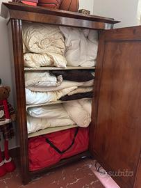 Vendo elegante armadio antico a un’anta in stile Luigi Filippo, realizzato in legno di noce con splendida venatura fiammata e pannello sagomato centrale. Mobile originale d’epoca, databile tra fine Ottocento e primi Novecento.