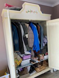 Vendo splendido armadio antico, restaurato con cura e rifinito in stile shabby chic. Questo pezzo unico è caratterizzato da una decorazione floreale dipinta a mano sulla parte superiore, cornici finemente evidenziate in tonalità dorate e un design elegante e intramontabile.