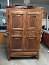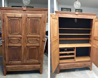 vendo armadio antico trasformato in mobile bar , pezzo unico di design , introvabile. Dimensioni massime circa 200 x 120 , divisibile in due parti per trasporto. L armadio è datato 1896 firmato all'interno dell'anta . L armadio è stato accuratamente restaurato in ogni minimo dettaglio, sanato disinfettato , sostituite le parti danneggiate e completamente riprogettato l' interno . Schienale , top , base , ripiani e tutto L interno sono stati fatti con legno nuovo , struttura ante e cassetto sono originali, e rivelano la patina originale del mobile , ripulito e verniciato con materiale trasparente opaco per preservarlo . All' interno l'armadio presenta in alto una struttura porta calici rovesciati che può contenerne circa 15 , due ripiani porta bottiglie e bicchieri di circa 22 cm di profondità , un piano di lavoro ad altezza bancone di 45 cm dove si può stappare la bottiglia o preparare un cocktail con grande effetto scenico. Sotto al piano una cantinetta espositiva per 18 bottiglie di vino a sinistra e spazio vuoto a destra per bottiglie di grandi dimensioni oppure per ospitare cantinetta refrigerata . Cassetto sotto con fondo nuovo e pomelli ad anello in stile . Ferramenta originale e perfettamente funzionante. Ideale per casa di design, vintage, rustico, locali , ristoranti, esposizione. Prezzo in privato, trattativa riservata, solo persone realmente interessate , no offerte ridicole , il mobile è unico nel suo genere.