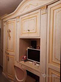 ARMADIO IN LEGNO 6 ANTE FATTO A MANO CON PORTA TV ,COMPUTER CENTRALMENTE CON CASSETTO E POLTRONCINA , CASSETTIERE INTERNE misure : altezza parte più alta mt.2.65 , lunghezza mt.3.10 profondo mt.0.62