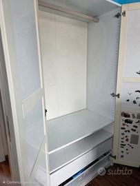 Armadio 3 ante bianco completo di asta appendi abiti, cestello e cassetti scorrevoli 150X60X201. L'armadio è composto da due moduli indipendenti. Soluzione rapida ed ideale se si vuole arredare B&B o abitazioni estive. Gli adesivi presenti all'interno sono facilmente rimovibili. Non spedisco.