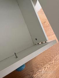 Il cassetto alla base ha la parte frontale sfilata e un po’ danneggiata. La struttura dell’armadio è comunque stabile e utilizzabile senza problemi. Ideale per chi ha bisogno di spazio contenitivo o per chi vuole sistemarlo con un piccolo intervento di bricolage.