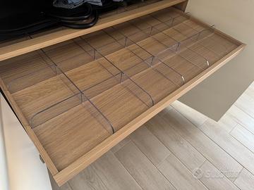 Armadio in legno bianco con ante Larghezza 3 m Altezza 2,35 m 4 scomparti (due doppi centrali e due singoli laterali). All'interno di ogni scomparto sono presenti luci al neon che si accendono all'aperture dell'anta (molto comodo nelle prime ore del mattino o nelle ore serali).