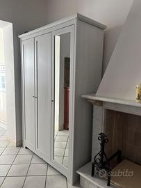 Armadio largo 130 cm x 90 cm di altezza con un’anta a specchio. La larghezza della parte appendiabiti è di 80 cm, mentre le mensole hanno larghezza 38 cm con altezza modulabile, come si vede in foto.