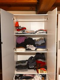 Armadio bianco Ikea con anta specchiata e anta in legno organizzato con una zona appendiabiti, mensole e un cesto dei contenitivo
