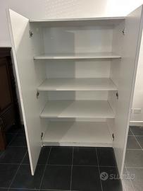Armadio bianco due ante e 4 ripiani. Misure in cm Altezza 157 Profondità 60 Larghezza 100 Buono stato ma lati bucati, come si vede in foto. Ritiro e trasporto a carico dell’acquirente