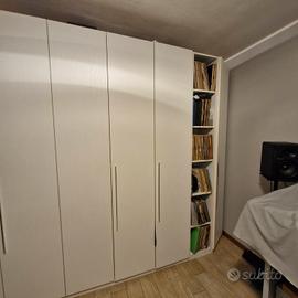 Armadio con 5 ante battenti da 45 cm, ripiano interno e tubi appendiabiti + 2 angoli finali con 5 ripiani interni, più libreria a vista.