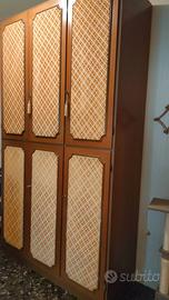 Armadio in legno con sei ante, tre inferiori e tre superiori. Decorato con stoffa a rilievo e chiusura con chiavi originali.