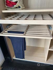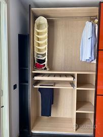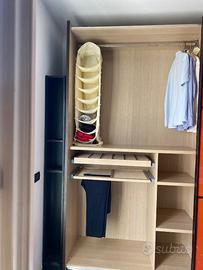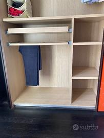 Bellissimo e solido armadio in rovere con doppia anta scorrevole e ferma anta, dotato di bastone appendiabiti, piano con divisori per cinture, cravatte, gioielli, porta pantaloni e tre divisori con ampio spazio. Misure lunghezza 276 cm/profondità 63 cm/altezza 253 cm. Smontato.il trasporto é compreso nel prezzo. Ho la persona che lo puo trasportare e montare.