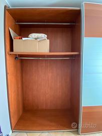 Armadio di grandi dimensioni con due ante scorrevoli, spazioso e ben organizzato all’interno.Finiture ciliegio e profili in alluminio delle ante