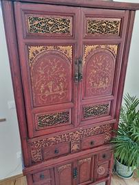 Mobile orientale a due corpi in legno di cedro laccato rosso, intagliato con motivi floreali e figurativi dipinti in oro. È composto da due parti che si impilano tra di loro, il che rende più semplice il trasporto. Un mobile di grande valore e carattere, per appassionati del genere, ideale per ingresso, salotto, studio o come pezzo unico in ambienti moderni minimal. Proviene dalla Cina ed è dotato di certificato.