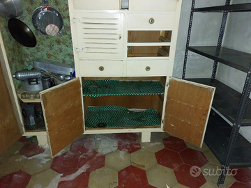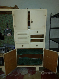 Vendo armadio cambusa, d'epoca, originale, anni '920, in legno massello verniciato colore bianco, completo ed integro, dedicato ad arredare cucine e tinelli, pratico e funzionale. Dimensioni cm 150x42, altezza cm 184