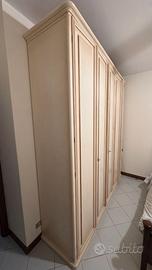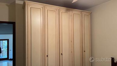 Vendo armadio da camera da letto a 5 ante in stile classico, colore avorio con finiture eleganti. Il mobile è usato ma tenuto molto bene.