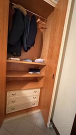 All’interno l’armadio è ben organizzato: sono presenti appendiabiti per giacche e camicie, ripiani per vestiti piegati e diversi cassetti molto comodi per biancheria o accessori. In alcune ante sono presenti anche gli specchi interni.