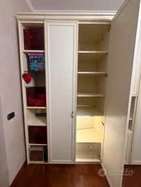 4 ante con appendiabiti sopra e sotto. Centrale con ripiani e vani a giorno, 2 ante con uno specchio interno, vari ripiani e 2 cassetti. Completo di illuminazione interna e parte finale a giorno con box Rossi.