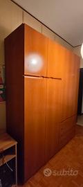 Armadio da camera da letto in ottime condizioni, a 4 ante e con cassettiera a 4 cassetti, di colore noce chiaro