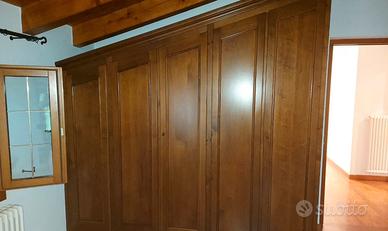 Armadio in legno noce nazionale suddiviso in due pezzi , adatto per mansarda, lato sx colore marrone lato dx verniciato colore naturale con varie striature legno ,le misure sono uguali per entrambe.