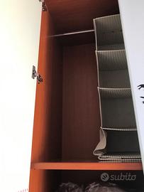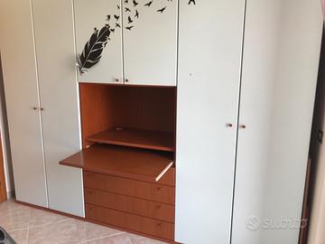 Vendesi armadio per camera cameretta colore ante verde molto chiaro con scocca, cassettiera e ripiani in color ciliegio