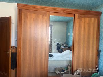 Vendo armadio a tre ante scorrevoli, struttura in legno noce dal colore caldo, con anta centrale dotata di ampio specchio che dona luminosità e profondità alla stanza.