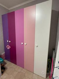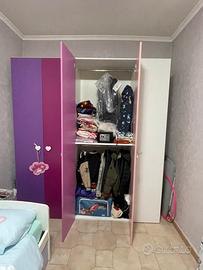 Armadio cameretta, 5 ante, maniglia a cuore in ottimo stato Misure: 228x55x244 (LxPxH) Interni, come da foto con doppia staffa appendiabiti e 3 ripiani Ritiro e smontaggio a carico dell’acquirente