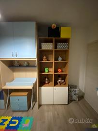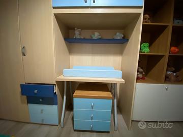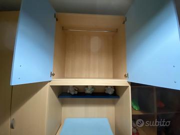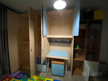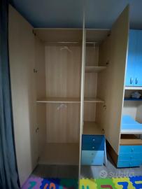 Armadio per cameretta corredato di scrivania. Armadio in legno nobilitato con cinque ante e quattro cassetti misura in totale 262cm di altezza 240cm di larghezza e 60cm di profondità. Le due ante a tutta altezza contengono due vani da 130cm di altezza e 90cm di larghezza. La terza anta ha 190cm di altezza e una larghezza di 45cm, al di sotto di sono 4 cassetti blu e celesti da 15cm di h. Le ultime due ante contengono un vano da 105cm di larghezza e 94cm di altezza, sotto si trova una mensola blu da 26cm di profondità. La scrivania può essere utilizzata come fasciatoio (cuscino compreso) ha le dimensioni di 90cm di larghezza 60 di profondità e 76 cm di altezza. Sotto il scrivania è presente un comodino mobile con tre cassetti celesti di 15cm ognuno. A lato dell'armadio ci sono due colonne di 40cm di profondità che hanno tre vani 45x45cm uno sportello bianco 66hx50L cm ciascuna. Contattami per ulteriori informazioni e chiarimenti.