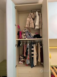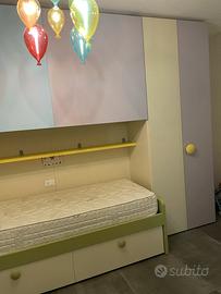 Vendo armadio nidi con comodino e cubotti per libri. Misure armadio: larghezza 393cm, altezza 254cm. Armadi centrali con ante scorrevoli e dotati di appendiabiti. Armadi laterali con 3 cassetti con chiusura ammortizzata e due vani appendiabiti.
