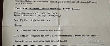Vendo armadio cassaforte con tre ripiani interni, altezza 160 larghezza 70 profondità 61. Scrivere solo se realmente interessati. Trasporto a carico dell’acquirente.