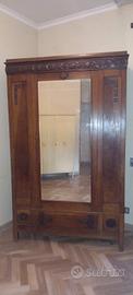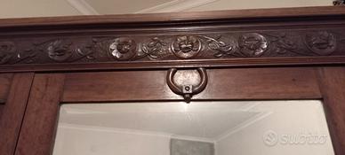 "Questo elegante armadio presenta uno specchio centrale all'esterno, che non solo aggiunge funzionalità, ma dona anche un tocco di luminosità e ampiezza all'ambiente. La cornice dello specchio è impreziosita da raffinati dettagli intagliati sul legno, con disegni decorativi che adornano gli angoli, creando un contrasto armonioso tra la lucentezza dello specchio e la calda texture del legno. La lavorazione artigianale delle incisioni conferisce a questo mobile un fascino classico e sofisticato, ideale per arricchire qualsiasi stanza con un tocco di eleganza senza tempo.