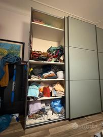 Vendo questo bellissimo armadio con 3 ante scorrevoli e ci sono al lato sinistro ci sono 4 ripiani in quello in mezzo come si vede dalla foto un appedi per giacche 2 ripiani con 3 buchi e sotto la cassettiera con 3 cassetti e nella parte destra con 4 ripiani chi e interessato mi scrive e in piu smontaggio e per portarlo di nel furgone da soli che io non posso portare cose pesanti e in piu sono al secondo piano senza ascensore.